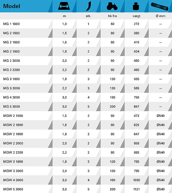MG-modellerne leveres uden pakker, mens MGW-modellerne leveres med rørpakkevalse som standard. MG- og MGW-modellerne har lige tænder med udskiftelige smalle eller brede spidser. Hvis jorden er meget vandlidende, kan der monteres en drænklods på grubbetænderne, så afdræningen fremmes yderligere.